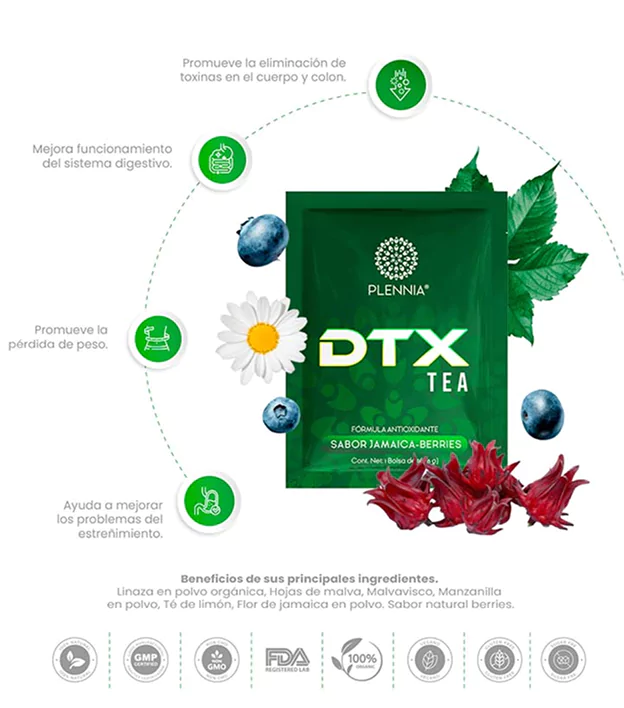 Linaza en polvo orgánica, Fibra de inulina, Cúrcuma en Polvo (Curcuma Longa), Hojas de malva (Malva sylvestris), Hojas de malvavisco (Althaea officinalis), Manzanilla en polvo (Chamaemelum nobile), Té de limón (Cymbopogon citratus), Extracto de papaya (Carica papaya L), Flor de jamaica (Hibiscus sabdariffa) en polvo y Sabor natural berries.